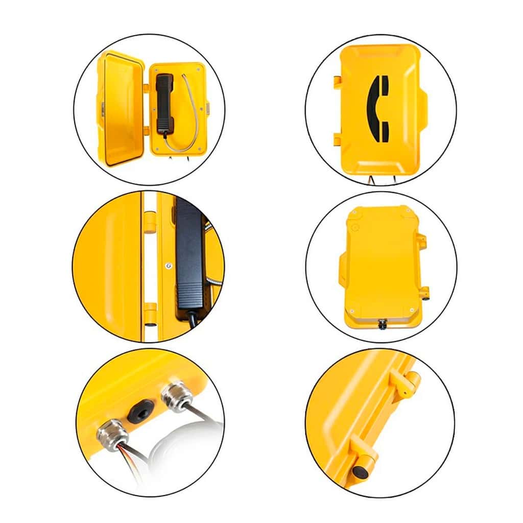 Este teléfono resistente a la intemperie es muy popular para túneles, minería, marina, sitios de construcción, áreas de altos hornos, subterráneos, estaciones de metro, plataformas ferroviarias, autopistas, hoteles, estacionamientos, plantas siderúrgicas, plantas químicas, plantas de energía, estaciones de petróleo y gas y relacionados. condiciones ambientales adversas industriales de alta resistencia, etc.