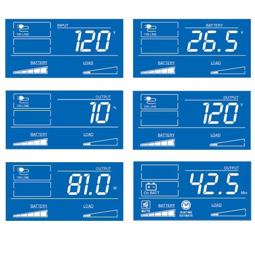 - Pantalla LCD del Panel Frontal: La pantalla LCD con botones de desplazamiento indica voltaje de entrada, voltaje de salida, frecuencia (Hz), estado de elevación de AVR / corte, carga de salida en Watts, porcentaje de carga de salida, carga de salida en Watts, voltaje de la batería y tiempo de respaldo estimado en minutos.