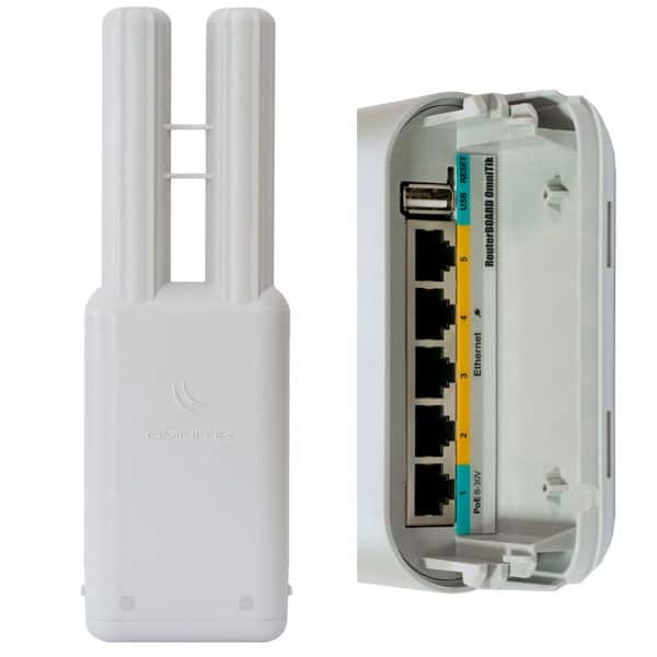 RBOmniTikUPA-5HnD, CPU 400Mhz, Memoria 32Mb, 5Ghz, antena Dual de 7.5, 400mW de potencia de salida, para exteriores, Licencia Nivel 4, 802.11 a/N , 5 Puertos 10/100 con salida PoE del 2 al 5 y USB para tarjeta 3G de celular .
